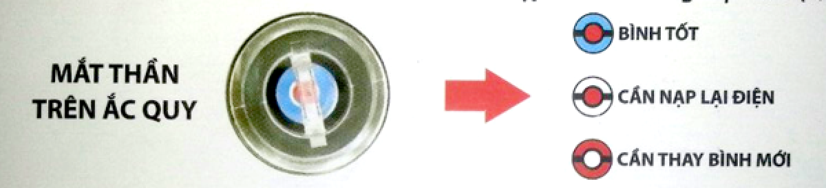 - Kiểm tra trường hợp này rất đơn giản hầu như mọi thương hiệu ắc quy khô để thiết kế có mắt thần cho chủ xe kiểm tra bình dễ bảo dưỡng hơn, Nếu mắt thần màu xanh như hình thì bình còn ok nếu chuyển qua màu vàng thì là đấu hiệu cảnh báo cần được sạc bổ xung hoặc thay thế bình mới . còn nếu là màu đỏ thì cần phải thay bình mới liền. phương pháp kiểm tra này chỉ dùng cho dòng ắc quy oto khô.
